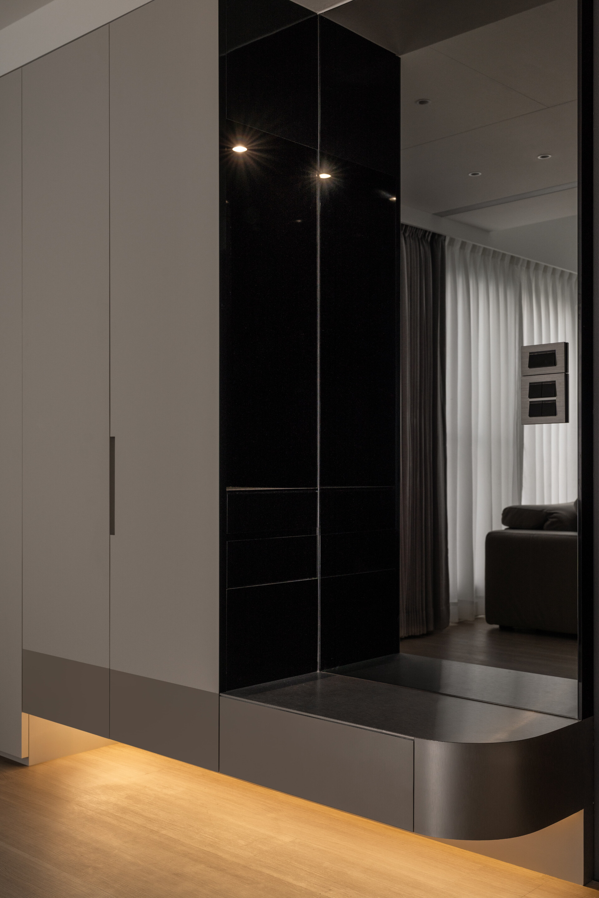 由玄關步入室內,首先映入眼簾的是不鏽鋼、素色美耐板、灰鏡與石材所構築的層次關係。線性光源沿牆面延伸,低調地引導動線,也在無形中界定空間節奏。