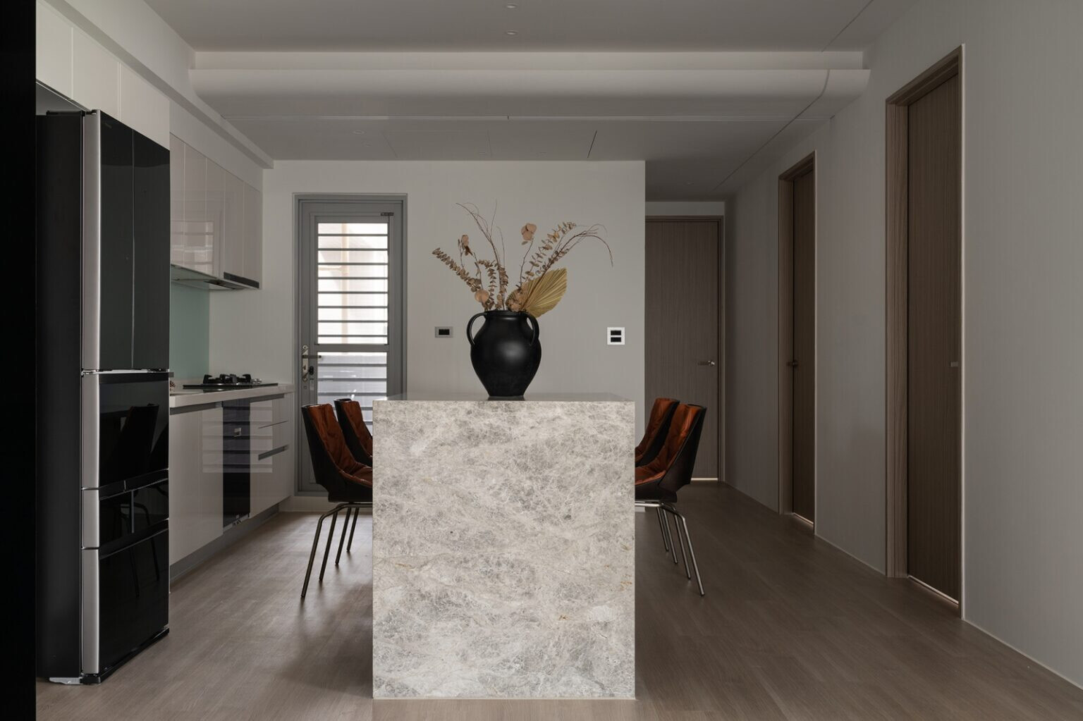 餐廳區域以中島為視覺與動線核心,光面灰色石材、木紋、鐵件與黑色美耐板交錯運用。不同材質在比例與接縫上的精準控制,使整體視覺保持高度一致性,同時保有豐富層次。
