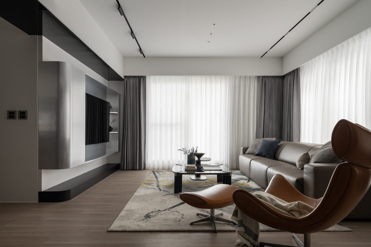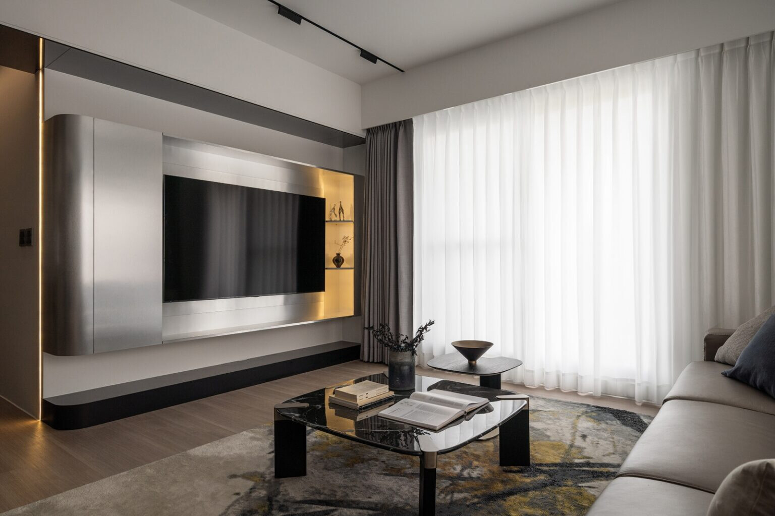 客廳電視牆以金屬拉絲面板為主體,搭配弧形收邊設計,削弱金屬材質的冷硬印象。下方與側邊配置間接照明,光線沿著牆面緩緩流動,使科技元素轉化為安靜的背景,而非視覺焦點。