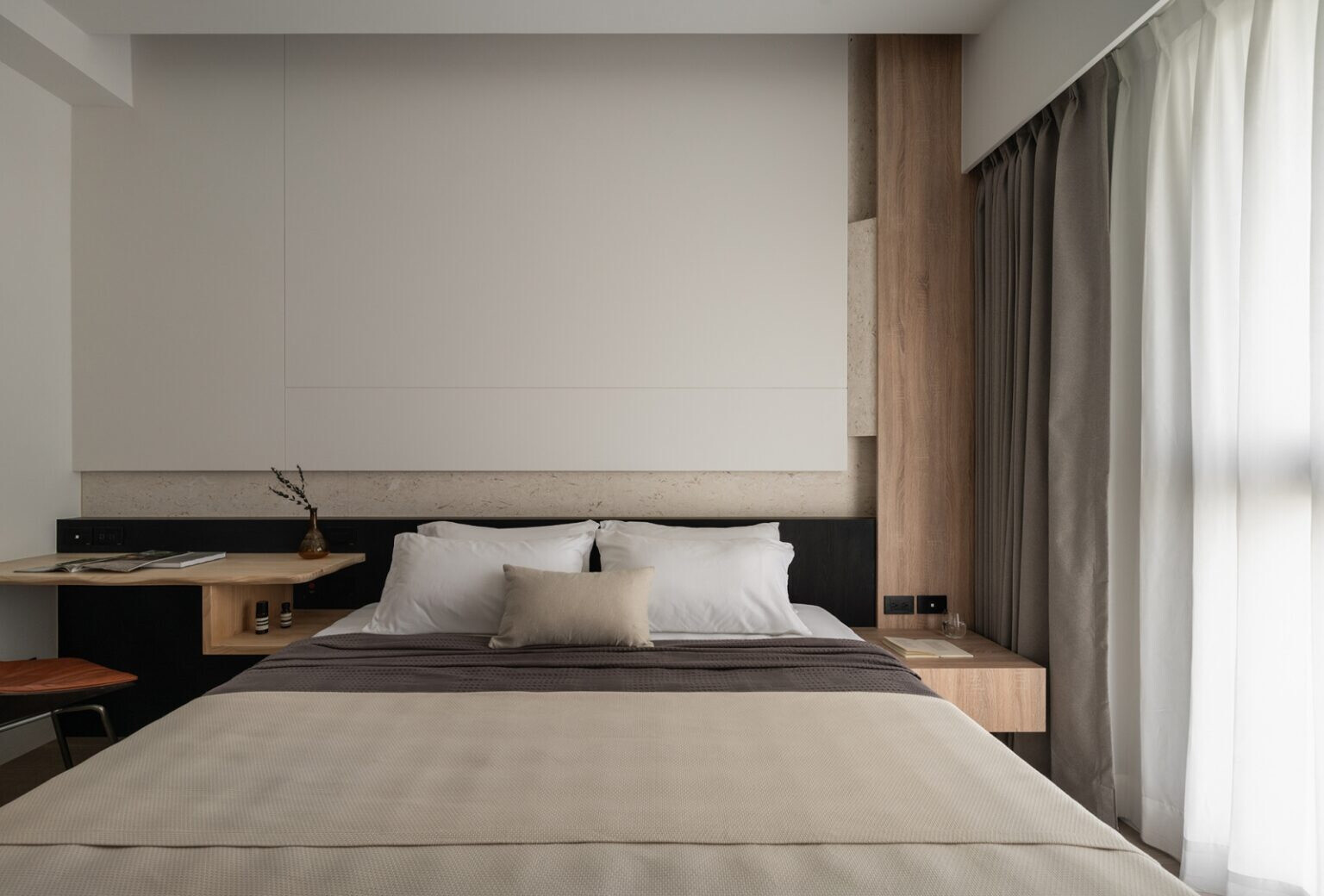 次臥延續主空間的材質調性,牆面選用灰階木紋與淺霧面壁材,營造柔和且中性的氛圍。簡易收納系統與柔性燈條配置,使空間能隨著時間與生活需求轉換角色,無論作為客房或其他機能使用,皆保有高度彈性。