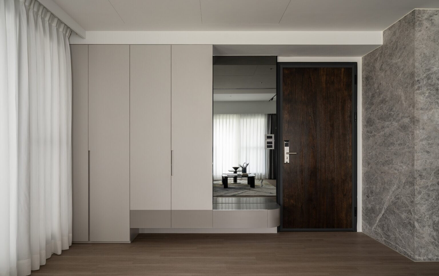從玄關進入,可見不鏽鋼、素色美耐板、灰鏡與石材的組構,配合線性光源引導動線,並巧妙將電箱與收納系統隱藏於牆體中,營造簡潔且俐落的第一印象。玄關左側柱體選用灰色仿古面石材,與室內石材運用形成同材異質的呼應。客廳區域的電視牆面設計,採用金屬拉絲面板搭配弧形收邊,結合下方與側邊的間接照明,呈現現代科技語彙。餐廳區域,中島與餐桌以光面灰色石材、木紋、鐵件及黑色美耐板混搭,展現異材質的精準銜接。整體場域視覺和諧豐富,並透過高度整合的收納規劃,營造出井然有序且層次分明的空間氛圍。次臥室延續主區域的材質調性,牆面鋪設灰階木紋與淺霧面壁材,結合簡易收納與柔性燈條,可因應未來變化作為客房或實現其他功能配置。