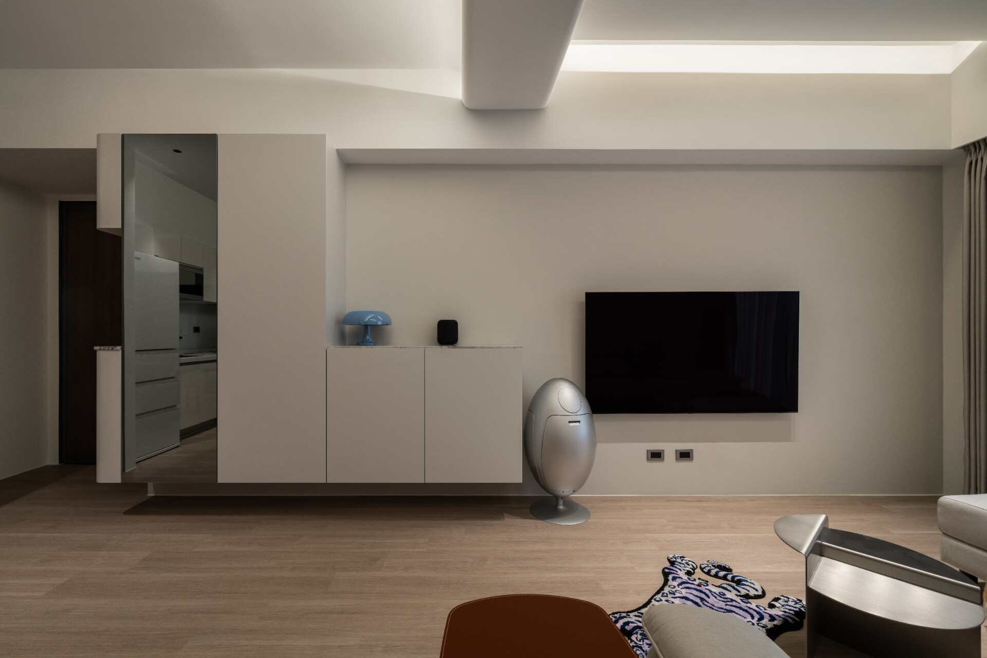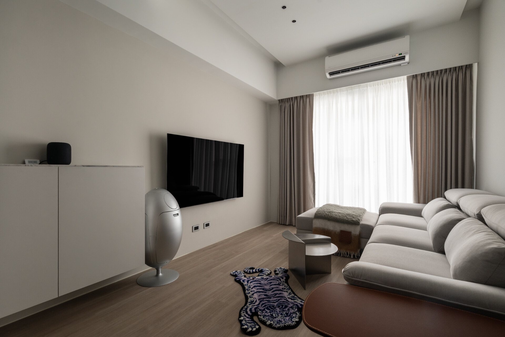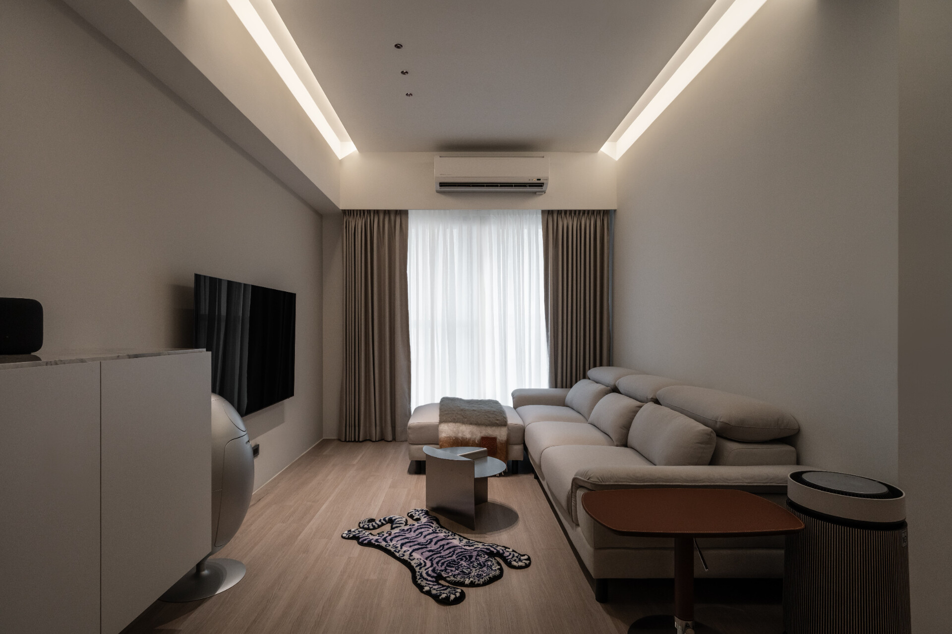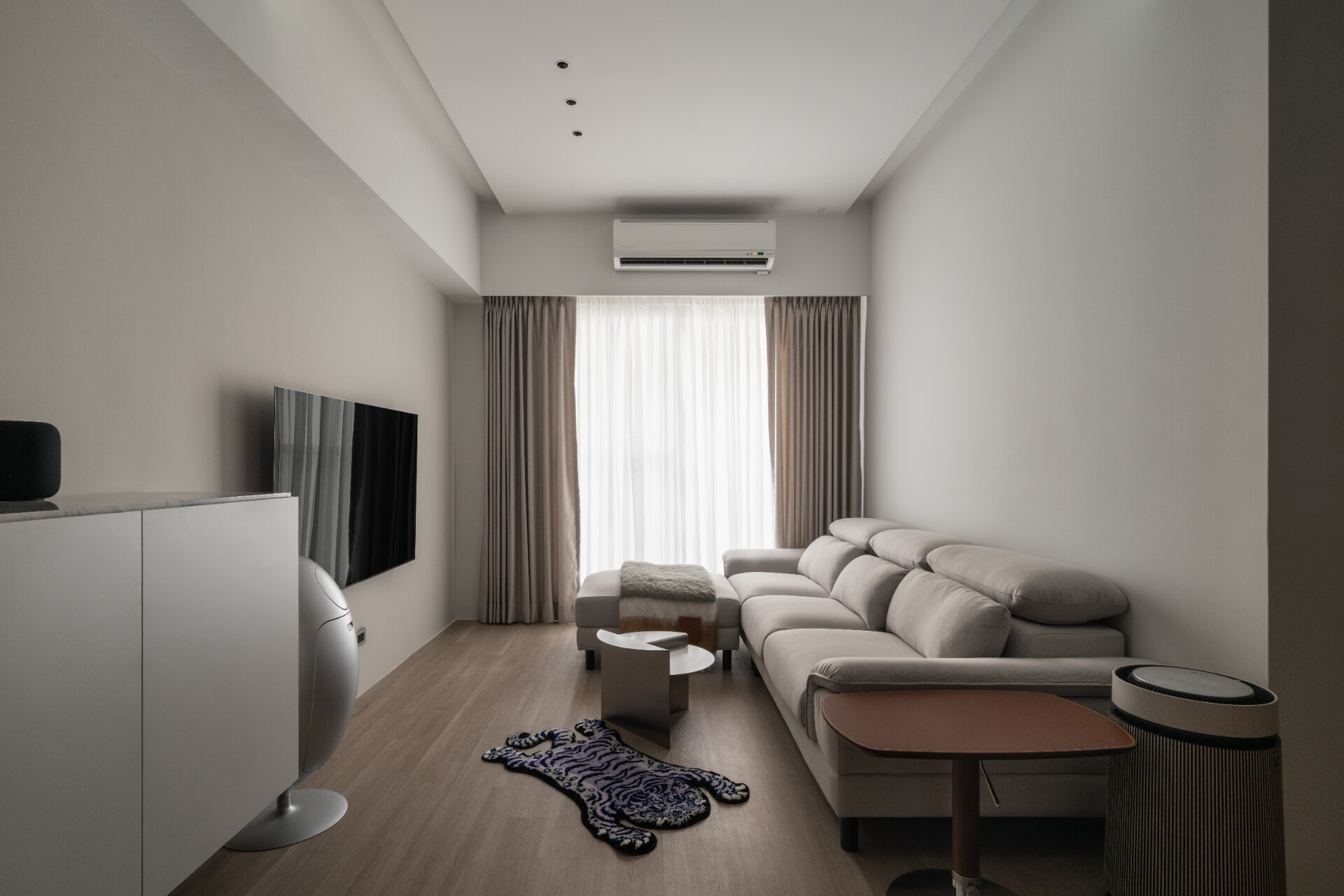 本案屋主追求極度純粹的居家美學,希望透過大量留白與冷灰調性,營造出高級感。考量到屋主養有一隻愛貓,我們規劃了開闊的公領域動線打造舒適的質感貓宅,並特別選用耐抓且易於維護的貓抓布沙發,讓毛孩與高質感生活共存。