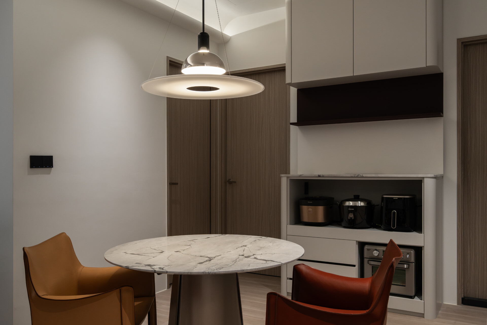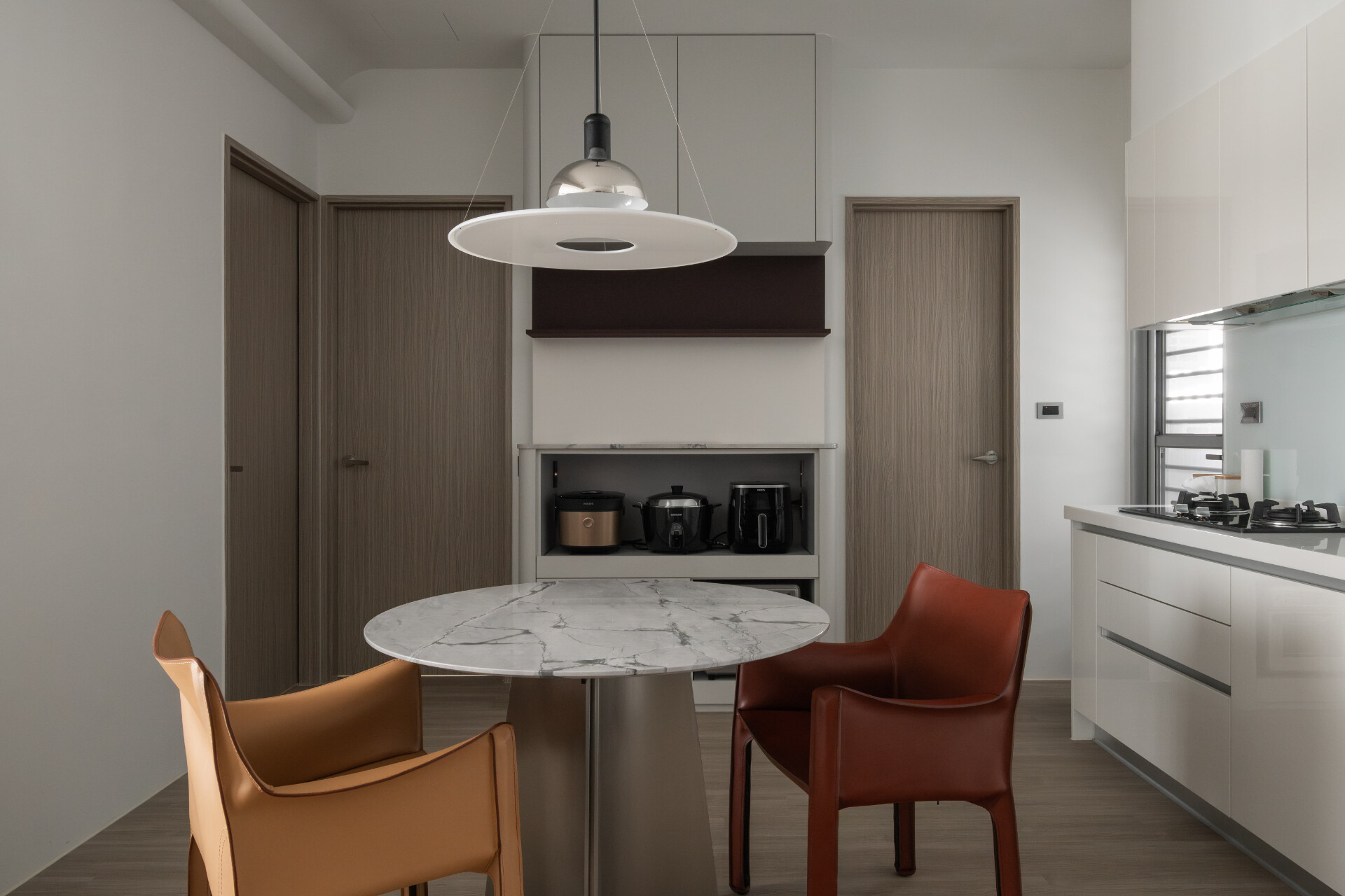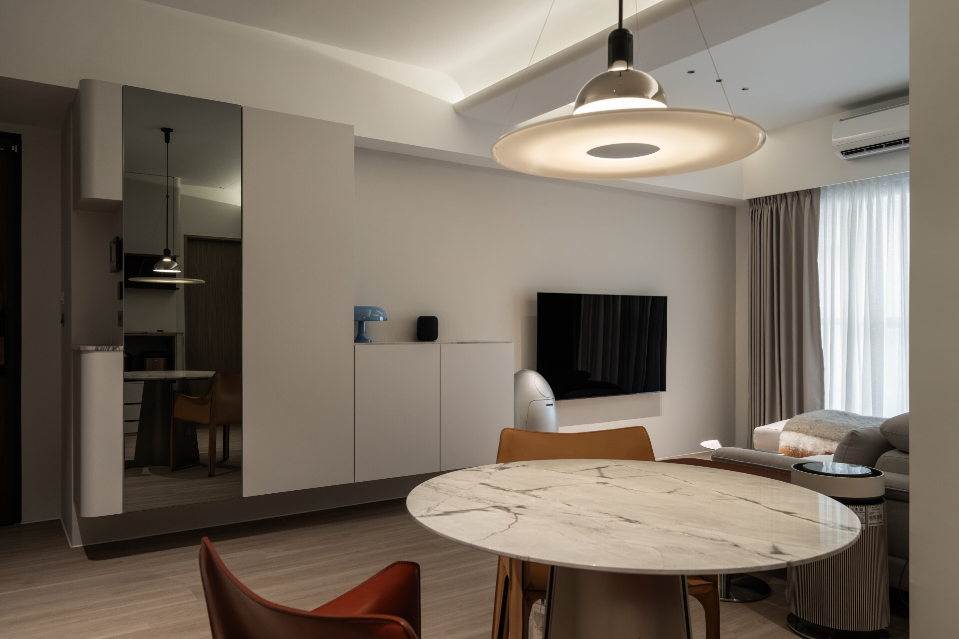 由於屋主對大理石材質情有獨鍾,我們在餐廳特別選用大理石圓桌作為視覺亮點,展現天然石材的內斂與大氣。在冷色調的層次堆疊下,結合天花板精準的線型燈光及間接照明,讓空間散發沉穩的高冷質感,完美打造出低調而精緻的居家品味。