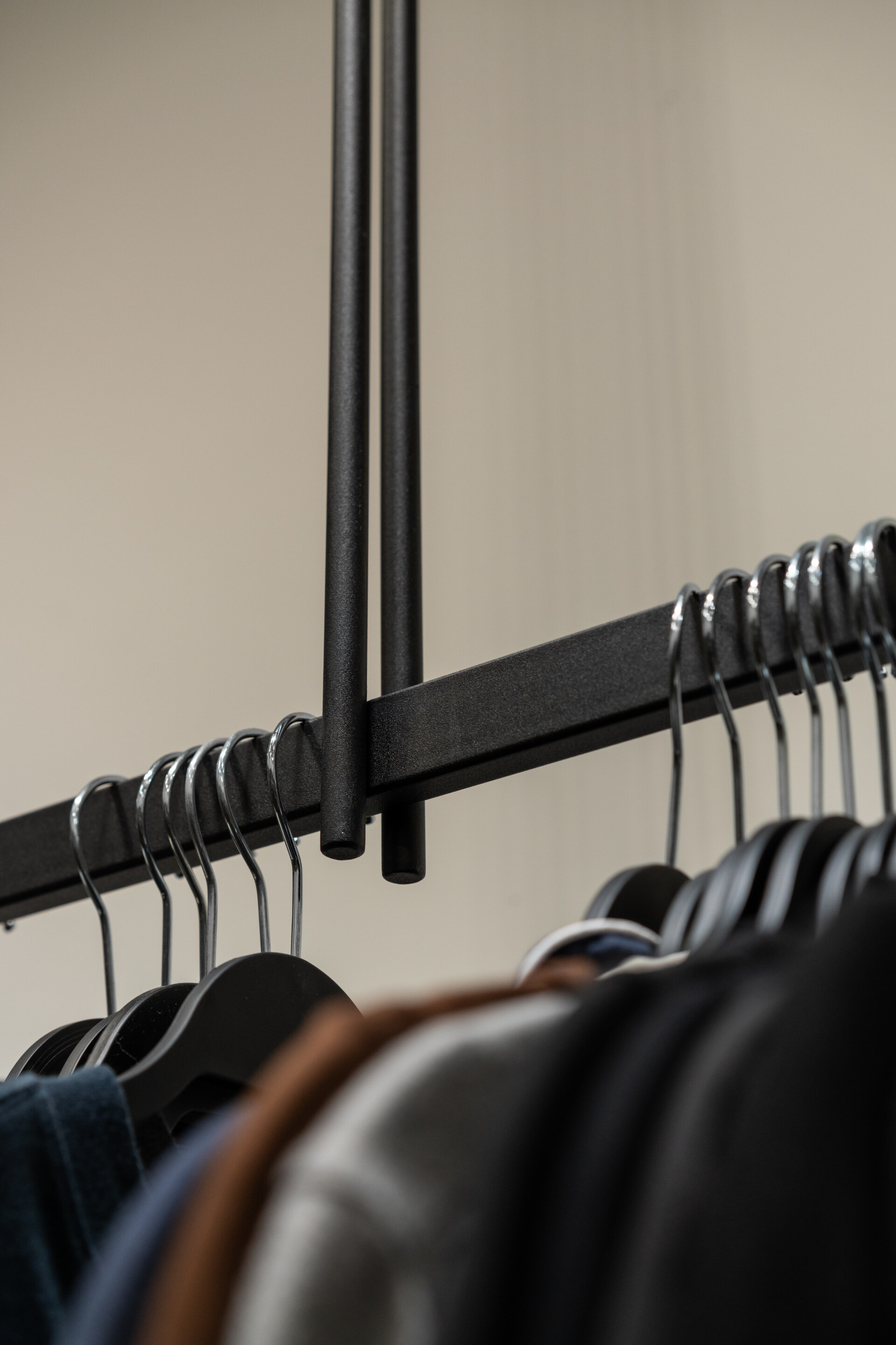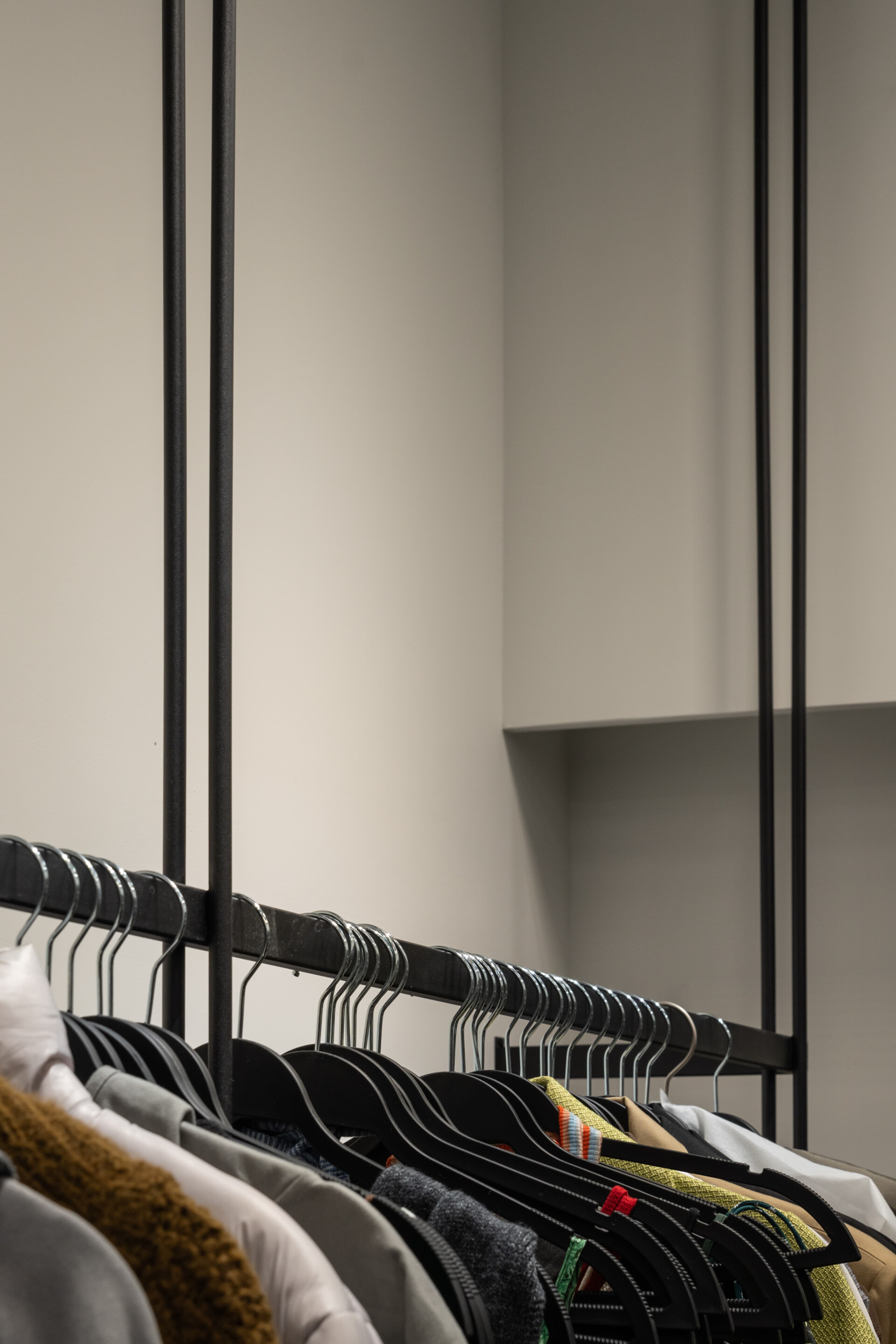 整體材質選用溫潤木質奠定家的溫度,並透過間接照明的層次勾勒,在暖意中注入年輕氣息。針對收納機能,我們以俐落的訂製鐵件打造開放式掛衣系統,不僅讓收納一目了然,更透過細緻的線條設計,讓實用的掛衣區也成為空間裡的精緻細節,兼顧了美感與生活機能。